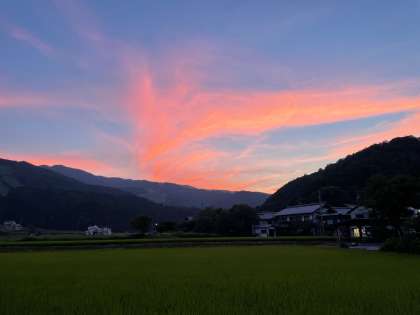 日が暮れる直前に、宿舎を出発して、ナイトハイキングに行きました。写真は、途中に見た夕焼けです。