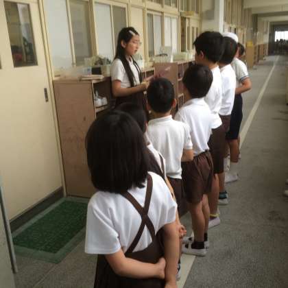 1列に並んで、掃除の反省をしていました。