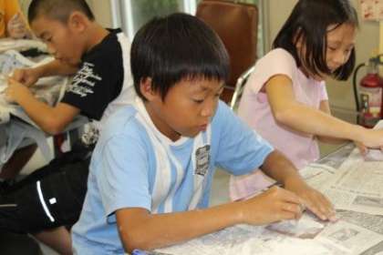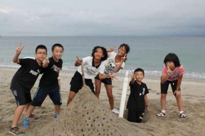 午後からもあいにくの雨模様。工芸室で勾玉づくりに挑戦しました。勾玉が完成するころ、雨も上がったので浜辺へ出て砂の造形を楽しみました。
