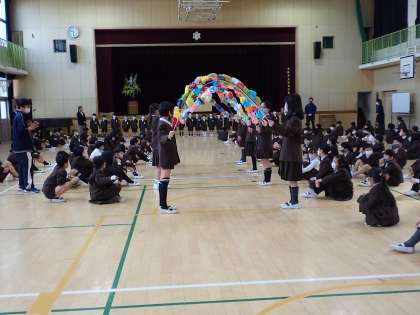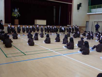 最後に、1年生がみんなに迎えられて入場です。在校生の前で、一列に並んで顔を見てもらい、「よろしくお願いします」とかわいらしく挨拶をしました。