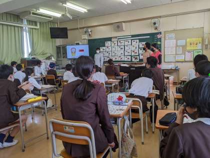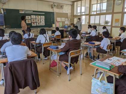 今年度もC-netの先生と、英語の専科の先生に来てもらって、学習がスタートしています。リズムに乗っていろいろな単語を発音しています。難しい単語もありますが、子どもたちはよく聞き取りながら発音を覚えています。