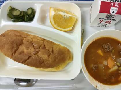 この日の給食は、ビーフシチュー、きゅうりのサラダ、あまなつかん、パンプキンパン、牛乳でした。大阪市の給食では、皮付きの果物が年に何回か登場します。