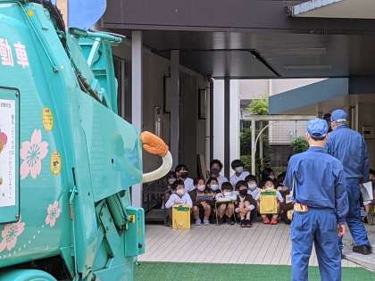 また、目の前で収集車を動かしてもらって実際に入れたものが集められるところを見せてもらったり、運転席に座らせてもらってその高さから運転時に気をつけることなどを教えてもらったりしました。