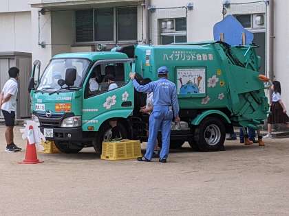 今日は大阪市の環境局からゲストティーチャーに来ていただき、ごみの分別や収集するときの工夫や苦労などの話を聞きました。