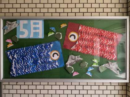 3年生が、今月の玄関の掲示を作ってくれました。一つ一つの鱗をみんなで協力して鯉のぼりを完成させました。とても元気に泳いでいる感じが伝わってきます。
