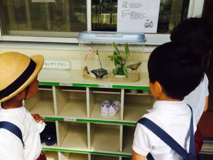 飼育ケースの周りで、アゲハチョウが巣立つ様子をじっと見ている子ども達と教職員。