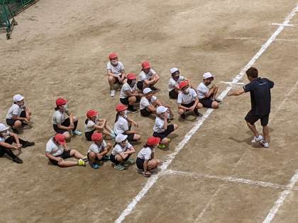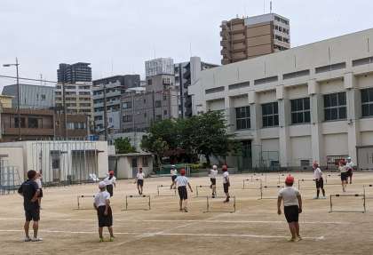 5年生の体育では、ハードル走に取り組んでいます。リズムよく走るにはどうしたらいいのか、ハードルの間を何歩で走ると走りやすいのか、いろいろ考えながら走っています。