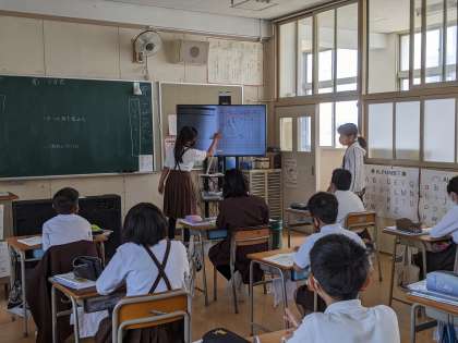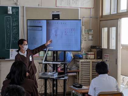 四角形の角の和を求める学習をしました。いろいろな考え方で導き出した答えを、書画カメラでテレビに写して、自分の考えを説明しました。わかりやすく上手に説明していました。