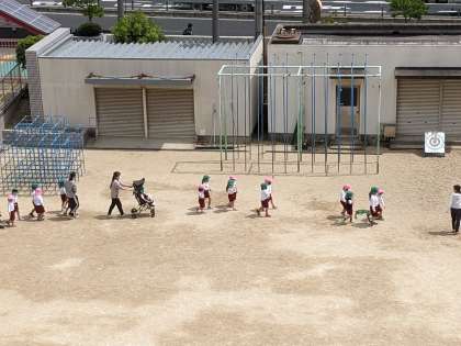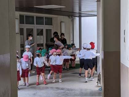 海老江西幼稚園では、内科検診等の検診を小学校の保健室で行います。今日はその事前見学に保健室に入らせてもらいました。その後、学校内をグルっと探検してきました。途中で、朝顔を植えに行く1年生のお兄さんお姉さんとすれ違いました。