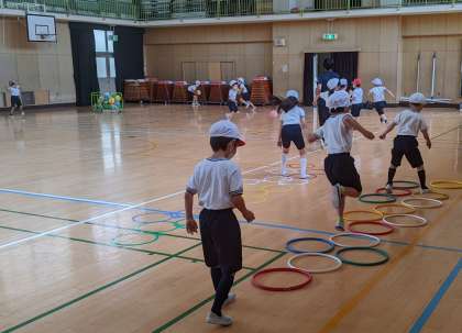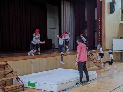 今日は講堂でサーキット運動をしました。運動場とは違う種目もあり、子どもたちは大ハッスルで取り組みました。ジャンプははじめは少しこわいなぁと思う子もありましたが、先生に見守られてエイヤっとチャレンジしていました。