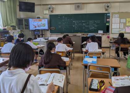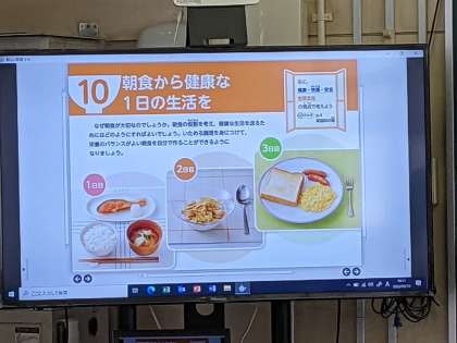 今日の家庭科では、朝食について学習しました。メニューを見ながら、どのような献立にすると良いのか、栄養のバランスを考えてみました。