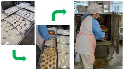 変わりピザは、ツナ缶、コーン、ピーマン、ピザソース、チーズを混ぜ合わせて、ぎょうざの皮の上にのせ、焼き物機で焼く子どもに人気の献立です。