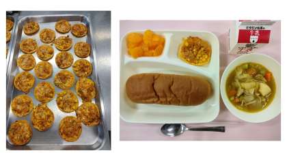 この日の給食は、豚肉と野菜のカレースープ煮、変わりピザ、みかん(缶)、黒糖パン、牛乳でした。