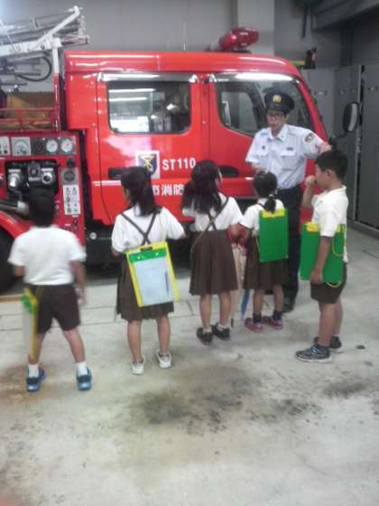 わくわくはっけんグループは、消防署をたんけんしました。救急車のなかに入れてもらったり、消防服を着させてもらったり、たくさんのことを発見しました。