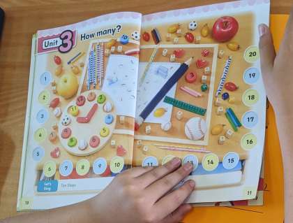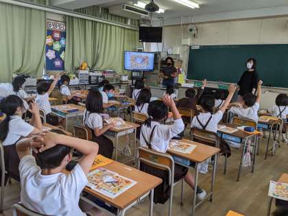 今日の外国語活動では、絵の中にあるものがいくつあるか、数えて、声に出して答えます。質問も英語で出されるので、どれを数えたらよいかをしっかり聞き取りながら元気に答えていました。