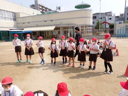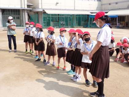 集会でゲームを楽しんだ後に、全校遠足のたてわり班で行った、オリエンテーリングの結果発表です。第3位、第2位、第1位と順番に発表され、児童会特製のメダルの授与がありました。みんなの拍手をもらって、うれしそうな笑顔が広がりました。