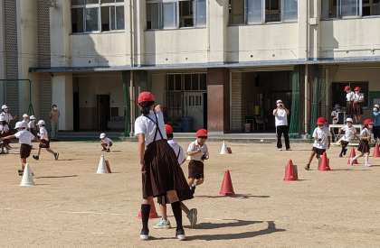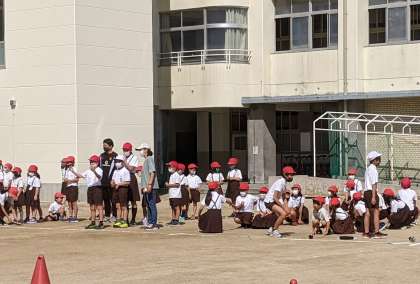 おたまでオタマジャクシを運んでリレーします。6年生が1年生のサポートをしたりしながら、アンカーにおたまがわたり、ゴールをめざしました。ゴールしたチームはカエルのポーズでゴールをアピールしていました。