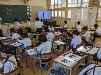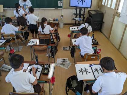 4年生は習字の時間に「林」を書きました。この字では、左右のはらいががポイントになります。一画一画、ていねいに、筆先に集中しながら書きました。