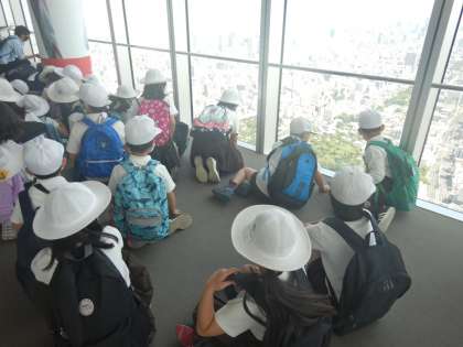 3年生は午前中、あべのハルカスへ社会見学に行きました。展望台に上がると、大阪の街が一望にできました。東の街並みは、北は、西は、南は・・・とグループで、その景色の違いや建物について見てきました。また、西側の一角には、床がガラス張りになっているところがあり、おそるおそるのってみたり、のぞき込んだりして、「こわ〜・・・・」と後ずさりする子もいました。