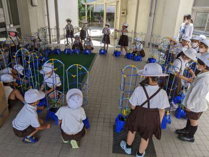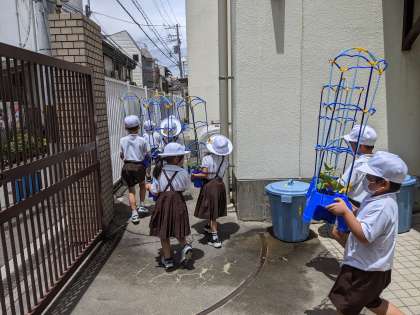 6月15日 1年生 アサガオ伸びてきたよ