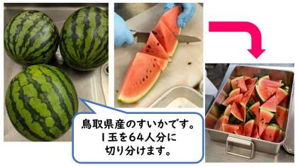 すいかは1年に1度登場します。鳥取県産のすいかが3玉届きました。これを1玉64人分に切り分けました。今年のすいかは甘く、こどもたちも喜んで食べていました。