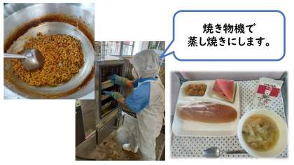 パエリアは、スペインのバレンシア地方の代表的な料理です。給食では、具材を混ぜ合わせ、ミニバットに入れてから焼き物機で蒸し焼きにしました。