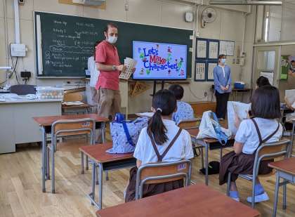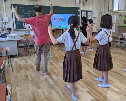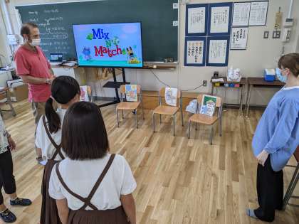 あいさつのあと、キャラクター作りをして気持ちをリラックスして、ダンスタイム。みんなで楽しく踊りました。休憩を挟んで、ゲームをしました。英語の説明ばかりでしたが、ルールをわかって楽しく楽しんでいました。