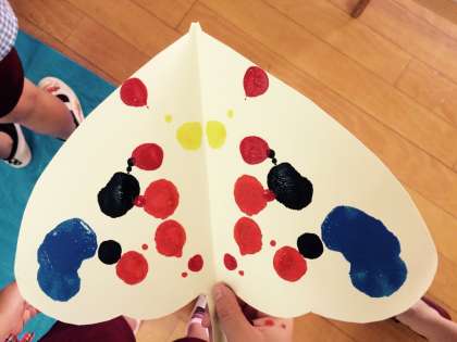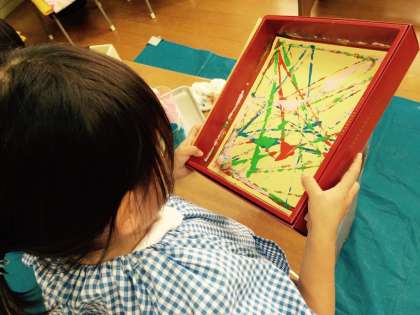 「デカルトマニーも、紙に絵具を落として、二つ折りにして開いた時、『きれい!』と言ってましたね。担任の先生が、絵具が混ざっても、混色の美しい色を選んで準備しておられたのがよかったです。」