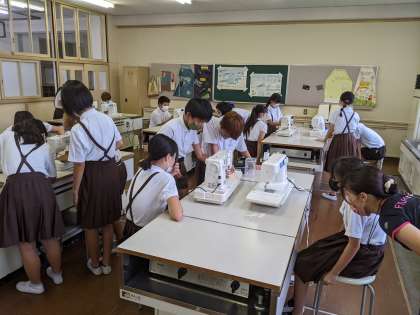 ミシンを使って学習するにあたって、上糸のかけ方など、ミシンの動かし方を覚えているか、みんなで確認です。迷いながらも、友達に教えてもらって、動かすことができました。これから作品づくりを進めます。