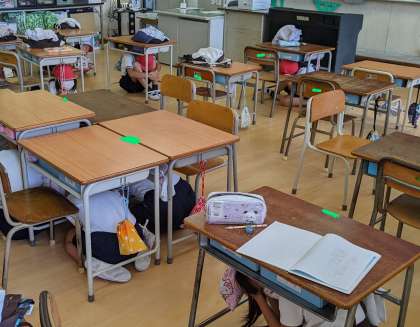 実施時間が昼休みだったので、いつもどおりの昼休みを過ごす中で、訓練に参加しました。教室で着替えを済ませて残っていた子、掃除の準備を始めようとしていた子、運動場で遊んでいた子など、それぞれの場所で自身への備えを確認しました。あとの大津波警報にも注意を払って、上の階へ退避しました。