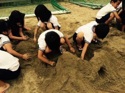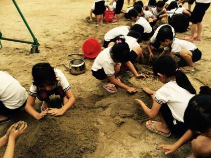 雨上がりの月曜日1時間目に、運動場の砂場で1年生が『どろんこ遊び』を楽しんでしていました。