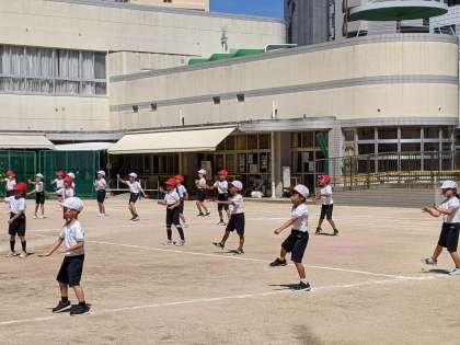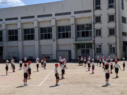いよいよあと2週間となった運動会。1年生は初めてのダンスです。2年生と一緒に、練習を重ねています。初めての運動場で場所の確認をしながら練習しました。