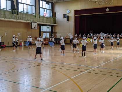 台風がすぎ、晴れ間も見えていますが、まだ、運動場が使えません。あと練習できるのは3日間ということで、今日は講堂でダンスの練習をしました。