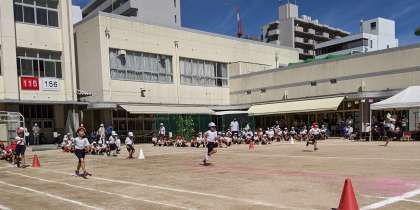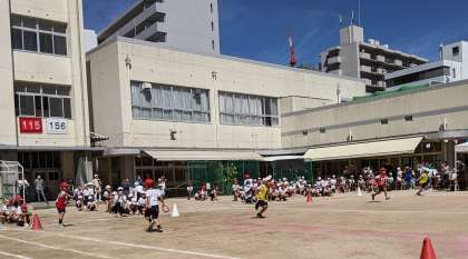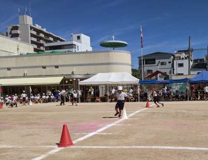 1・2年生は、リングをバトンに、コーンをクルッと回って走ります。上手に小回りをきかせて走りました。