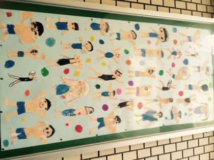 玄関掲示は、1年生が描いた『プール水泳』の絵です。