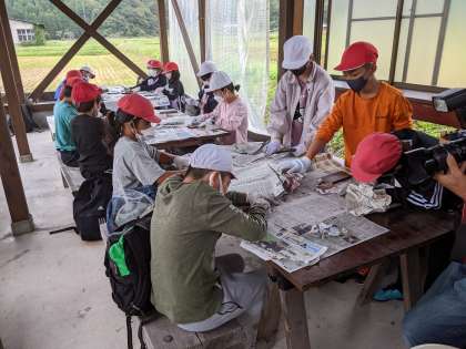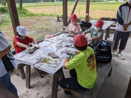 焼き板工作、スタートです。まずは、板に残っている炭になっているところを新聞紙で磨いてきれいにしていきました。