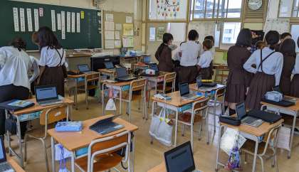 6年生は国語で、2つの考えから自分が選んだことについて、グループで話し合い、違う意見の人を説得するディベートに挑戦しました。