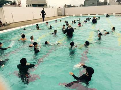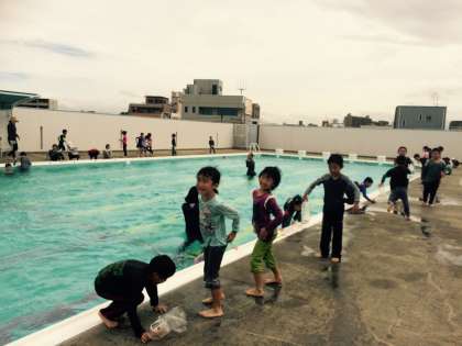 プールサイドに上がろうとしますが、服が重くて、なかなか上がりにくそうです。