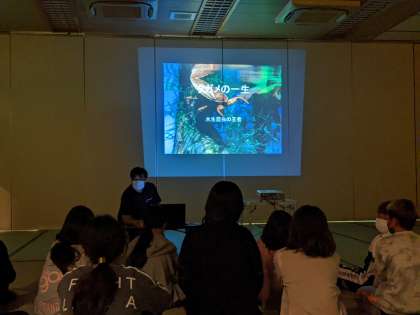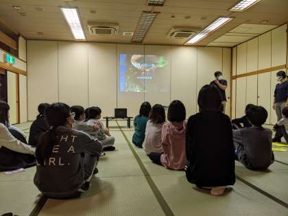 食事の後は、少しアカデミックな時間を過ごしました。明日行く鳥羽水族館の学芸員の方に宿まで来ていただいて、水の生き物の話をしてもらいました。今夜は水生昆虫「タガメ」の話でした。へえー!と驚く話や映像がたくさんあって面白かったです。