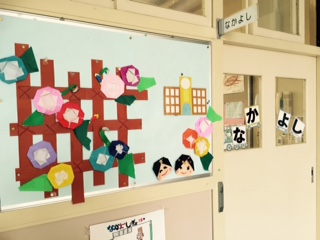 掲示板には、子ども達が共同で作った、色とりどりのアサガオの花が、美しく咲いています。
