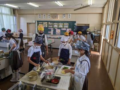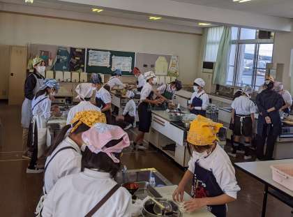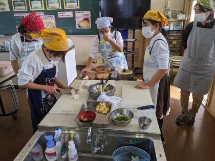 調理実習でご飯を炊いて、お味噌汁を作りました。ご飯はガラスのお鍋で炊きあがっていく過程を観察しながら進めました。お味噌汁は具に、薄揚げ(短冊切り)・大根(銀杏切り)・ネギ(小口切り)をいれ、切り方の違いも確認しながら作りました。美味しくできたかな?