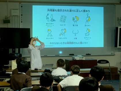 学校薬剤師の先生に、「くすりの正しい使い方講座」と題して、薬剤師のお仕事、薬のはたらき、自分の体を守る自然治ゆ力、薬物乱用と防止について教えていただきました。
