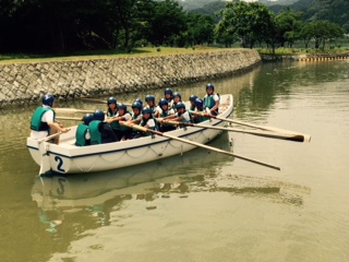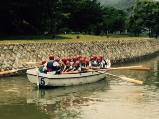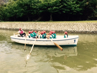 自然に囲まれた空間で、円山川に漕ぎ出します。仲間との一体感、達成感を味わって、カッター体験、頑張ろう!