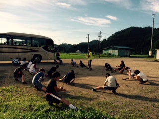 6:20 駐車場で朝のつどいをしました。鳥の鳴き声や蝉の声、草の匂い、美味しい空気をいっぱいすって体操をしました。
