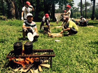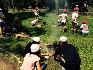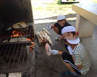 子ども達、火の熱さと日の暑さにめげず、頑張ってます!