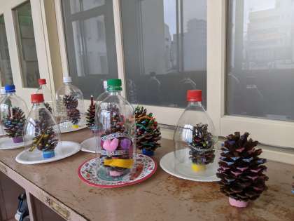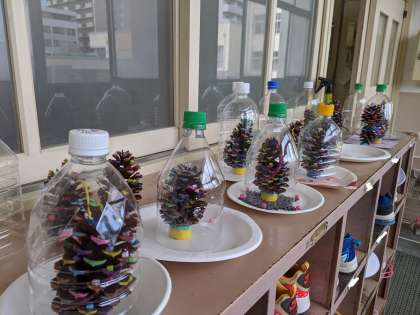 1年生の教室の前にカラフルでかわいい松ぼっくりツリーが飾ってあります。ペットボトルでカバーをすると高級感もでて、いい感じになっています。