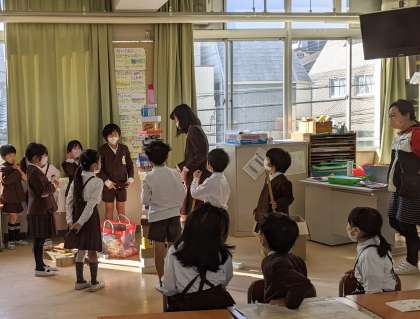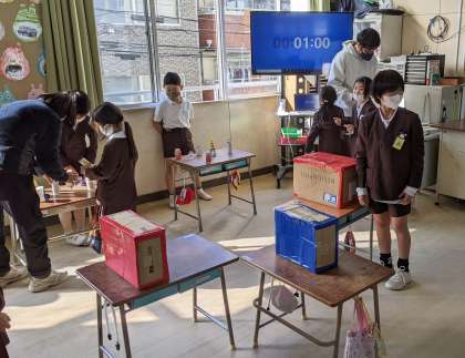 1年生は「ドキドキ ハラハラ はこつみゲーム」です。すごい高さまで積み上げたグループがありました。