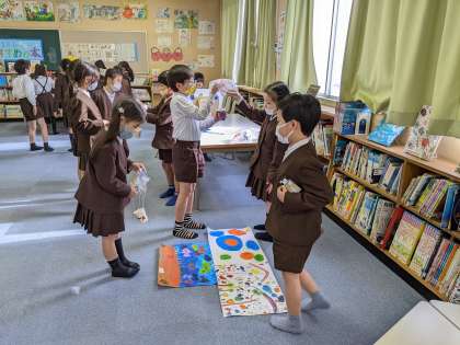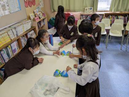 2年生が生活科で作っていたおもちゃが完成し、グループごとに披露し、お互いに遊んでみました。明日、1年生を招待するので、うまく説明できるか、おもちゃで楽しく遊べるか、最終確認をしました。
