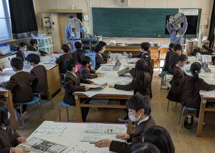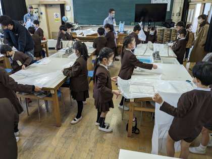 2年生は、被災したときに、身近にあるもので身を守る物を作ろうと、新聞紙を使ったスリッパづくりと、ビニル袋を使った簡易レインコートづくりに挑戦しました。