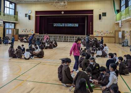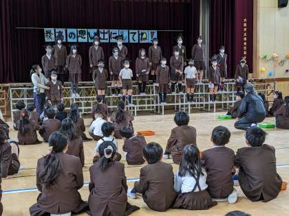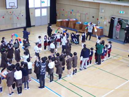 祝う会の最後は、みんなで講堂に集まって、たてわり班ごとにプレゼントを渡しました。そのあと、6年生からお礼の言葉とプレゼントがありました。最後は、幼稚園のみんなも来てくれて6年生を送りました。